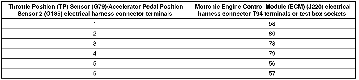 - Using a Multimeter, check the Throttle Position (TP) Sensor (G79)/Accelerator Pedal Position Sensor 2 (G185) electrical harness connector terminals to the Motronic Engine Control Module (ECM) (J220) electrical connector T94 for an open circuit.
