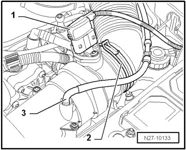 - Loosen the spring clamp - 2 - using (VAS 5024A) and disconnect the connector - 1 -.