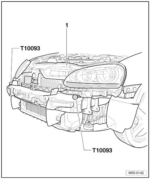 - With the aid a second technician, unscrew guide rod (T10093) on longitudinal member on left and right sides and lift out lock carrier - 1 -.