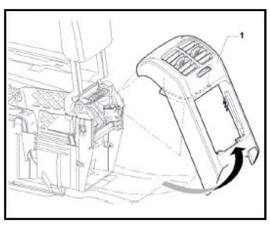 ^ Open rear cup holder (1) and remove two fasteners (2).