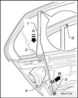 - Remove center bar - 4 - from seal of fixed door window - arrow B -.