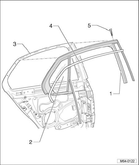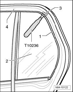 - Disengage window guide - 1 - with fixed door window - 2 - on inside and outside all around from window frame - 4 -.