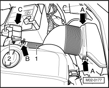- Disconnect connector - arrow C - from Mass Air Flow (MAF) sensor and lay connector aside.