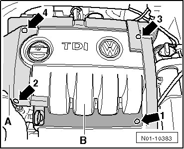 - First place engine cover on to rear mounting points - arrows B -, then on to front mounting points - arrows A -.
