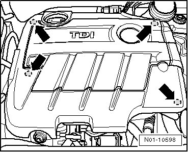 - Disengage engine cover at the retaining points - arrows - and remove engine cover upward.