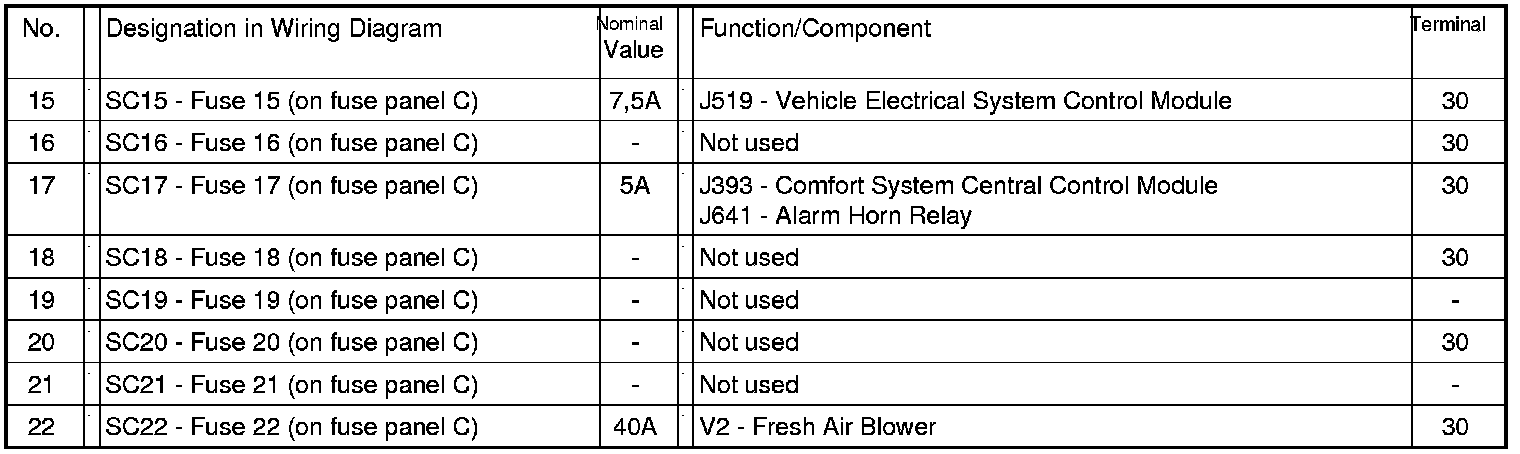 Fuses (SC) on fuse panel C (electronics box Low), from July 2006
