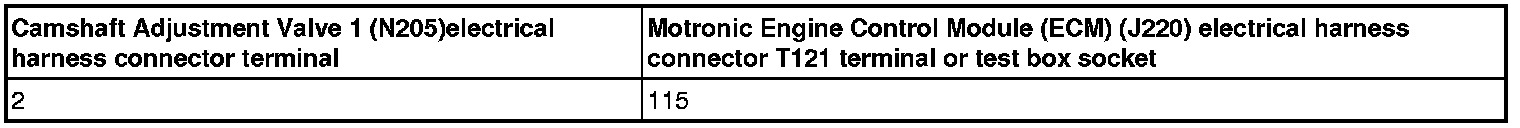 - Using a Multimeter, Check the Camshaft Adjustment Valve 1 (N205) electrical harness connector terminal 2 to the Motronic Engine Control Module (ECM) (J220) electrical harness connector T121 terminal 115 for resistance.