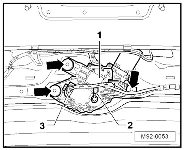 - Pull the hose connection locking ring - 2 - to open it and then remove the hose from the connection on the rear window wiper motor - 1 -.
