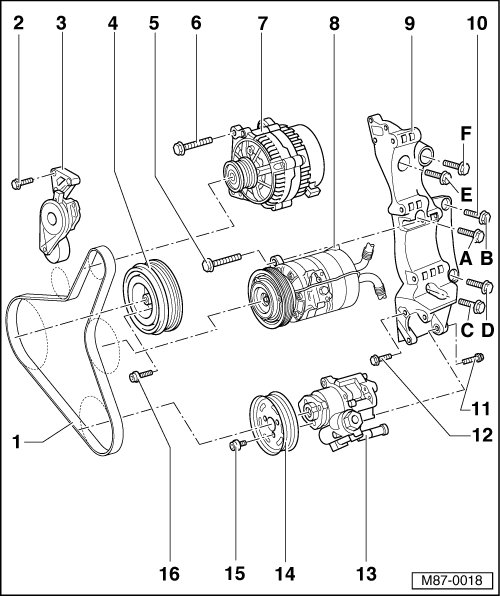 - Remove compressor - 8 - from bracket, swing away and secure in engine compartment with wire => [ A/C Compressor, Securing to Body ] A/C Compressor, Securing to Body.