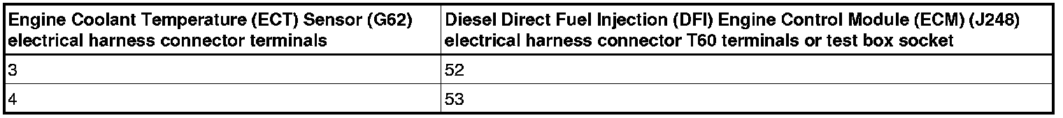 - Using a Multimeter, check the Engine Coolant Temperature (ECT) Sensor ( G62) electrical harness connector terminals to the Diesel Direct Fuel Injection (DFI) Engine Control Module (ECM) (J248) electrical harness connector T60 terminals for resistance.