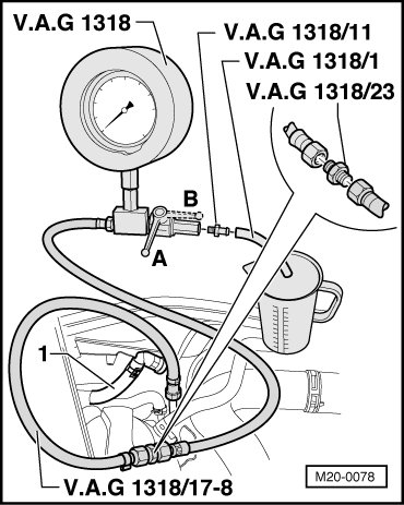 - Connect hose (V.A.G 1318/1) onto adapter (V.A.G 1318/11) of pressure gauge and hold it in a measuring container.