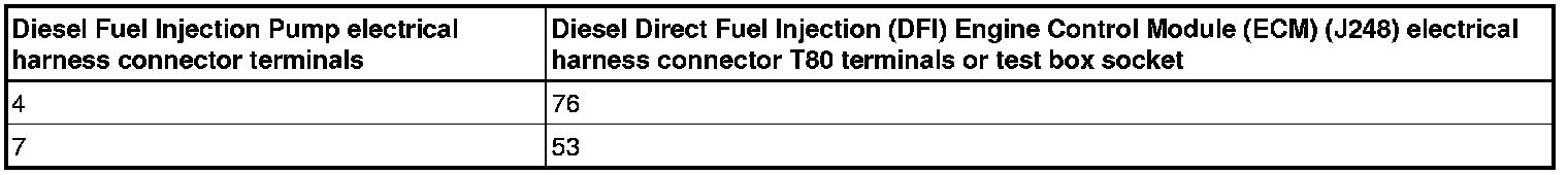 - Using a Multimeter, check the Diesel Fuel Injection Pump electrical harness connector terminals to the Diesel Direct Fuel Injection (DFI) Engine Control Module (ECM) (J248) electrical harness connector T80 terminals for resistance.