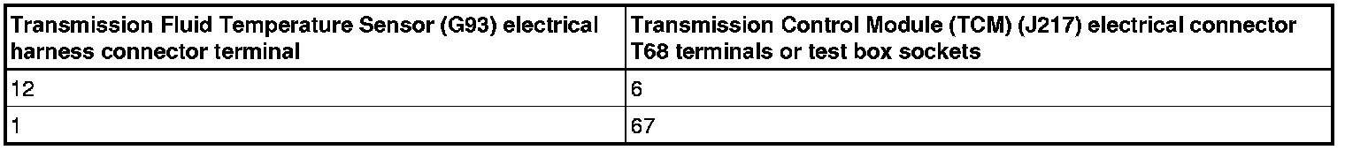 - Using a multimeter, check the Transmission Fluid Temperature Sensor (G93) electrical harness connector terminals to the Transmission Control Module (TCM) (J217 ) electrical harness connector T68 terminals for an open circuit.