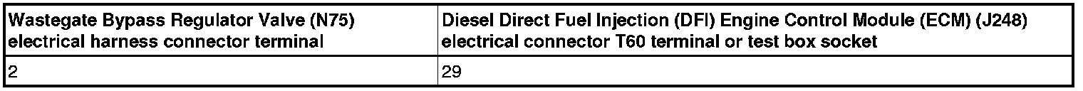 - Using a multimeter, check the Wastegate Bypass Regulator Valve (N75) electrical harness connector terminal 2 to the Diesel Direct Fuel Injection (DFI) Engine Control Module (ECM) (J248) electrical harness connector T60 terminal 29for an open circuit.