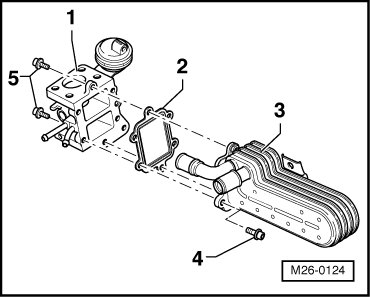 - Attach the by-pass flap - 1 - with a new seal - 2 - and two bolts - 5 - to the Exhaust Gas Recirculation (EGR) cooler - 3 - and hand-tighten these bolts.