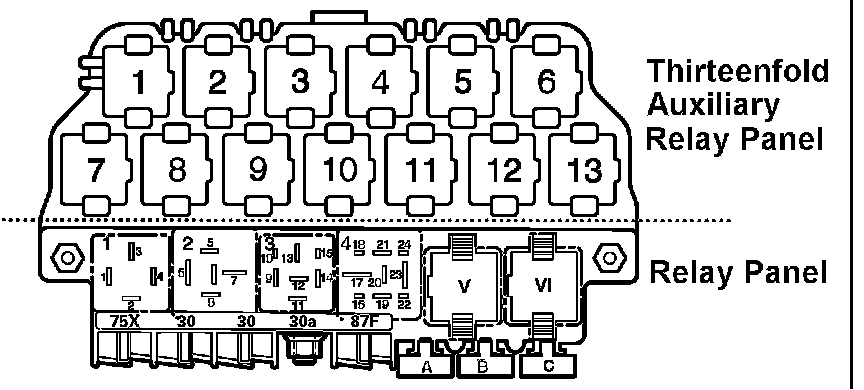 Relay location on the thirteen position auxiliary relay panel, above relay panel: