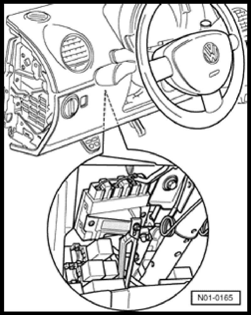 The control unit for the central locking control unit -J393- is located under the instrument panel and is secured to the steering column by a bracket. It is equipped with a DTC memory. The On Board Diagnosis (OBD) connection is located beneath the cover under the steering wheel.