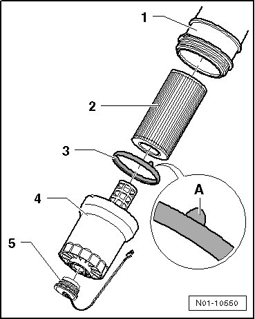 The oil filter housing sealing ring - 3 - must be replaced each time the oil filter insert is changed - 2 - or every other time the oil filter housing is loosened.