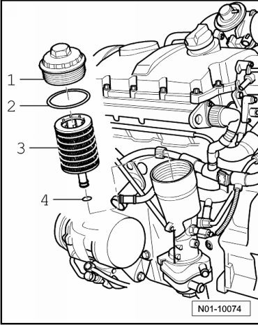 - Install oil filter housing - 4 - with new sealing ring - 3 - and new oil filter insert - 2 - by hand until almost on oil filter housing stop - 1 -.