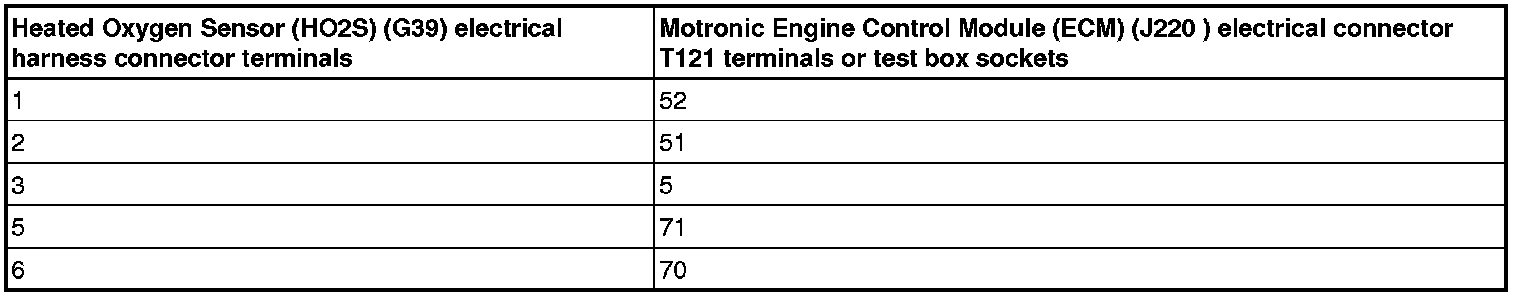 - Using a multimeter, check the Heated Oxygen Sensor (HO2S) (G39) electrical harness connector terminals to the Motronic Engine Control Module (ECM) (J220) electrical harness connector T121 terminals for an open circuit.