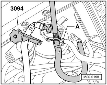 - Connect the (VAG 1397A) with the T-piece and 6 mm diameter hose between the vacuum line - 1 - and the LDP - 2 -.