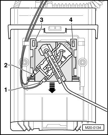 - Pry up the retaining tabs - 3 and 4 - using screwdriver and pull the fuel level sensor downward in the - direction of the arrow -.