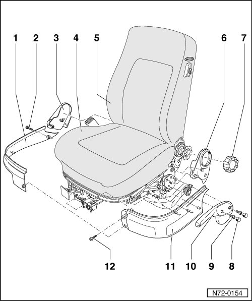 - Unscrew the bolt -=> [ (Item 2) Bolt for Right Trim ] Front Seats Overview- and remove the trim -=> [ (Item 1) Right Seat Trim ] Front Seats Overview-.