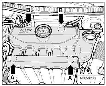 - First, pull engine cover at mounting points - arrows A - carefully out of retainer.