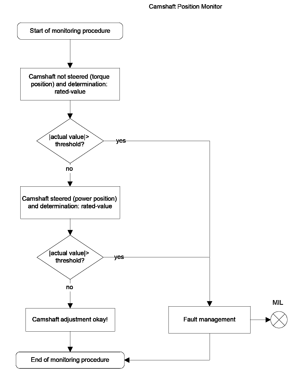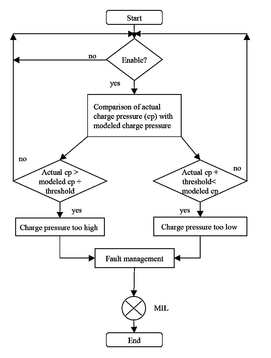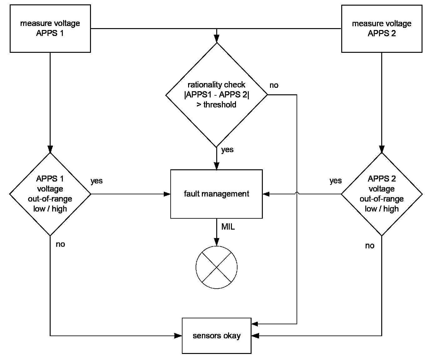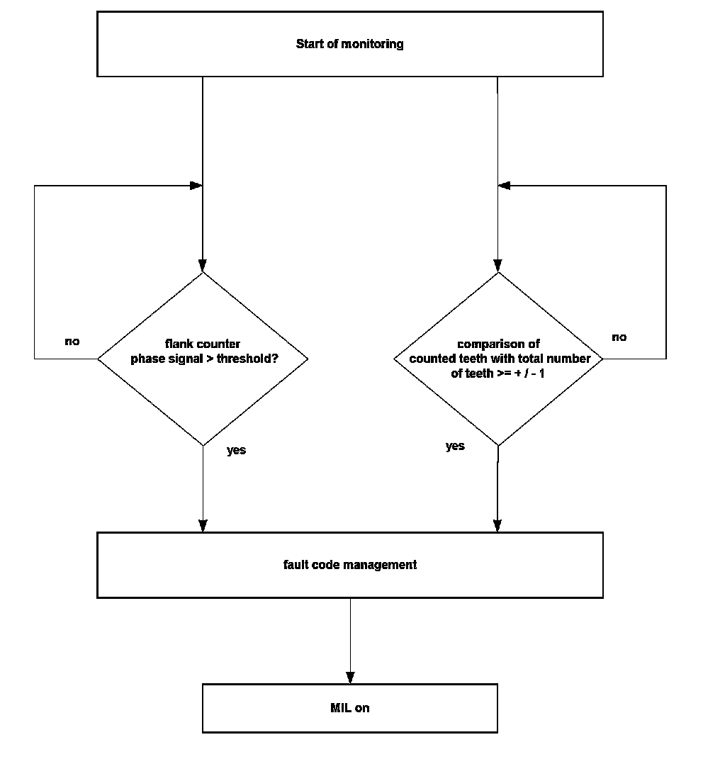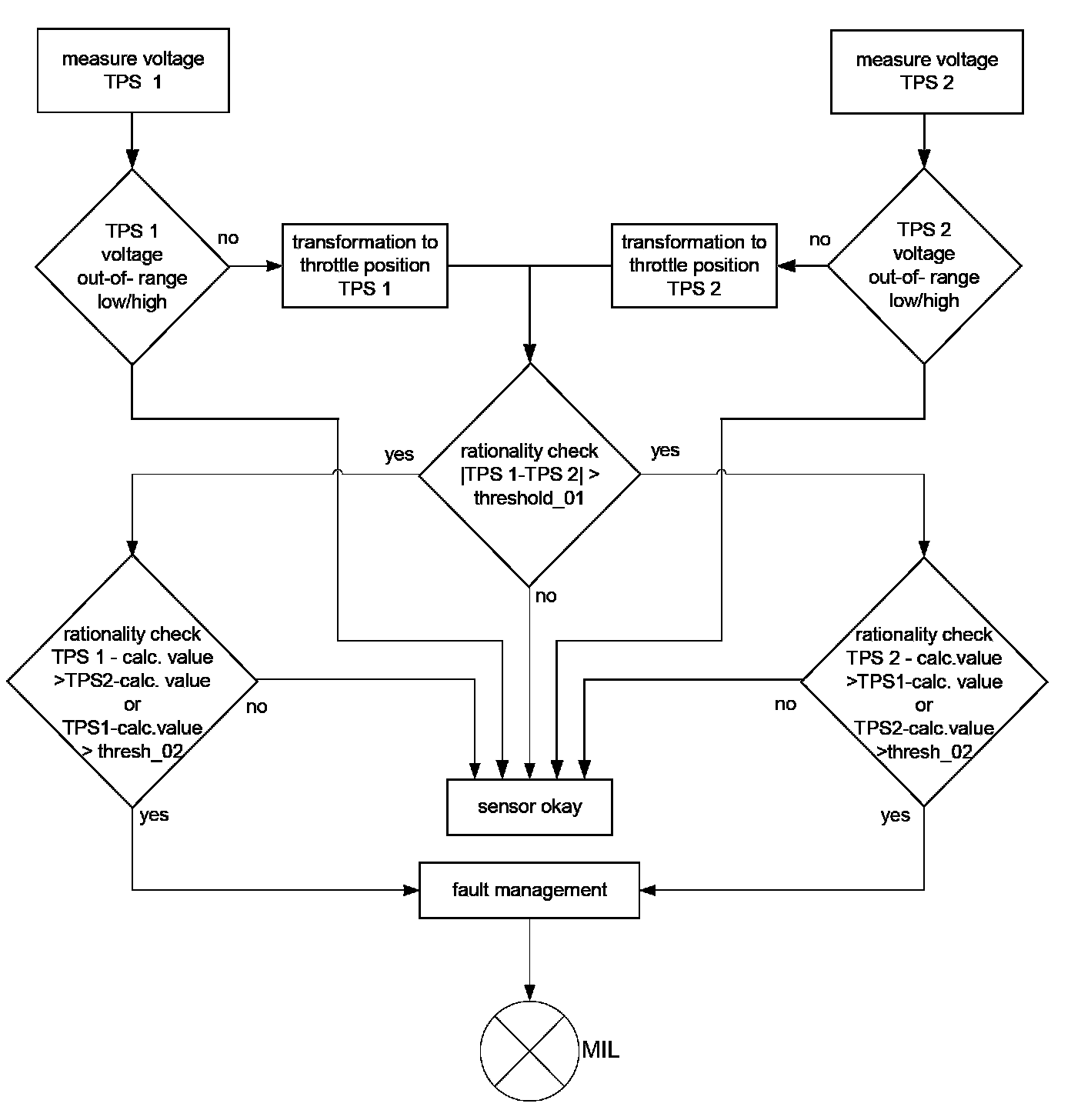 The throttle body consists of two potentiometers (reversed voltage logic). During the first start, the potentiometer characteristics are adapted and stored. The diagnostic monitors the corrected values of potentiometer 1 and 2. In the case of a higher difference than a threshold value both signals are compared to the engine load to determine and disable the faulty one. A fault code will be stored and the MIL will be illuminated.