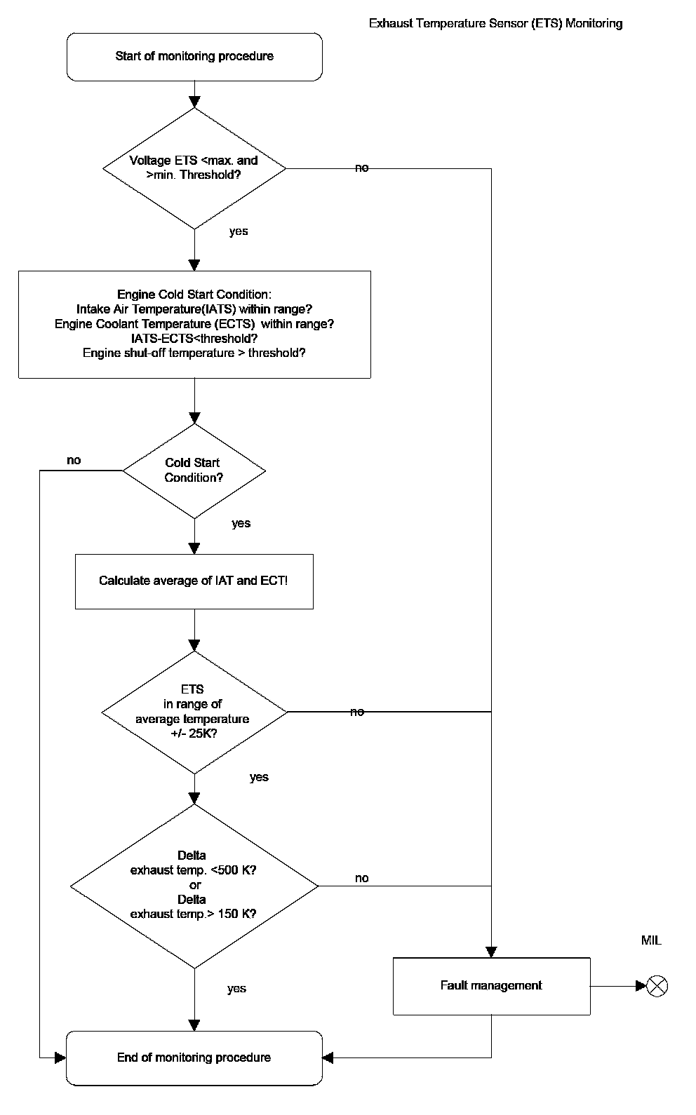 After engine has been cold started the slope of ETS is monitored and should not be higher than a max. Threshold and not lower than a min. threshold.