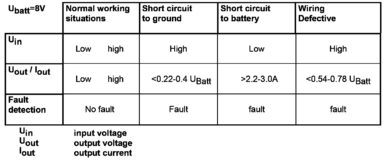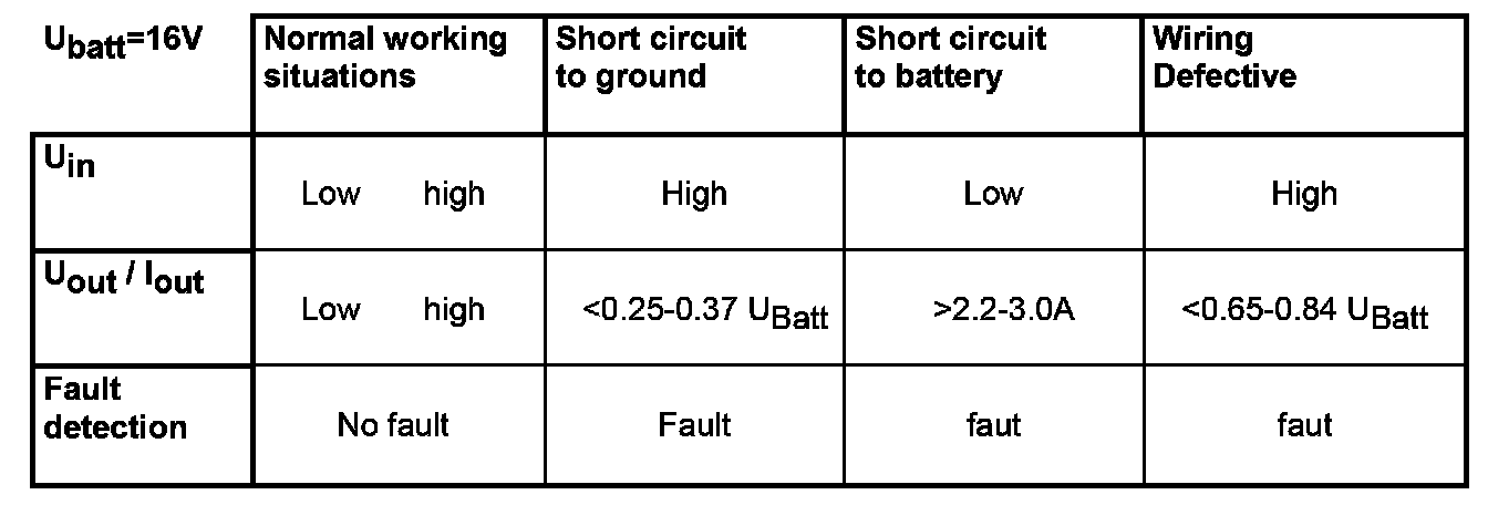 The IC has a binary diagnostic line (e.g. SJ401). If the control line of one stage has a different signal than the output line, the logic circuit inside the IC detects a malfunction. The logic circuit within the IC can separate the type of fault to a short circuit to minus, an open line, or a short circuit to plus. The check result will be sent to the ECM via diagnosis line.