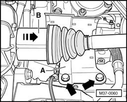 - Remove right drive axle - B - from transmission in direction of - arrow -.