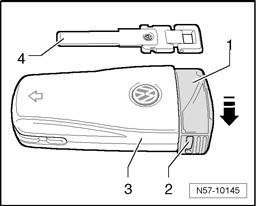 Press side button - 2 - on remote control key - 3 - and remove emergency key - 4 -.