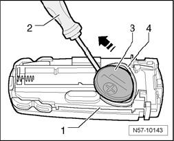 - Guide battery - 2 -, with plus pole facing up, at an angle - arrow - into retainer - 3 - of remote control key - 1 - (plus pole is marked in housing).