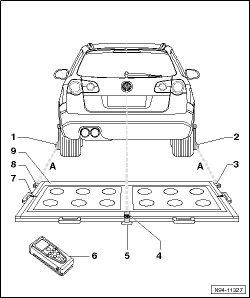 - Position the calibration device (VAS 6350/4) behind the vehicle with a distance of 1.2 m to 1.7 m between the angled brackets on the calibration device and the paddles at the rear wheel center wheel mounts as shown in the overview illustration - dimension A -=> [ (Item 9) ].