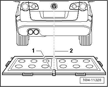 - Switch on the laser on the calibration device - 1 - and align the entire calibration device so that laser beam - 2 - strikes the rear of the vehicle centered above the VW emblem.