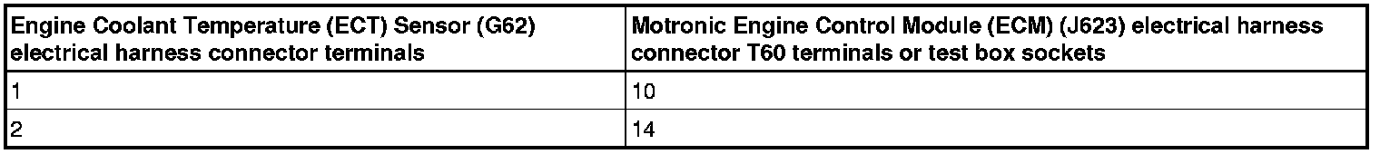- Using a Multimeter, check the Engine Coolant Temperature (ECT) Sensor (G62) electrical harness connector terminals to the Motronic Engine Control Module (ECM) (J623) electrical harness connector T60 terminals for an open circuit.