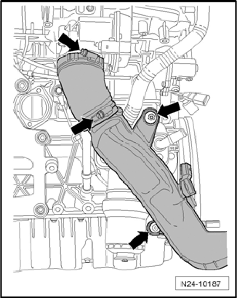 - Loosen bolts and clamps -arrows- and remove charge air pipe with charge air hose downward.