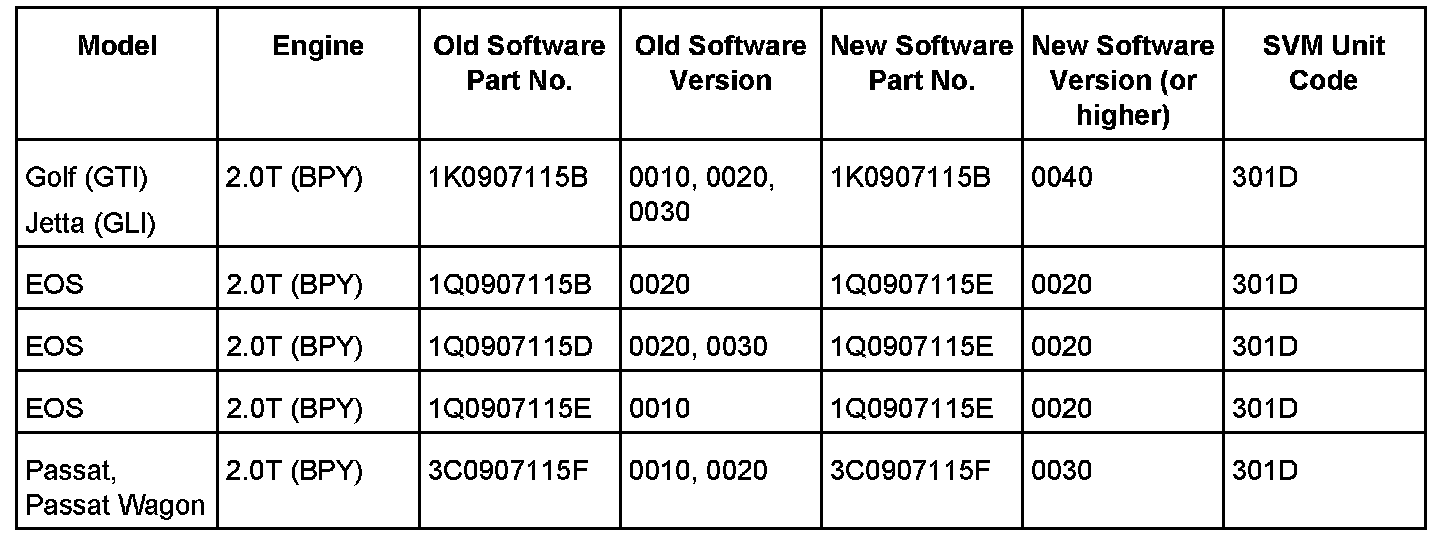 Update the Engine Control Module and/or Transmission Control Module using the Software Version Management (SVM) and the SVM Unit code as listed in the table above.