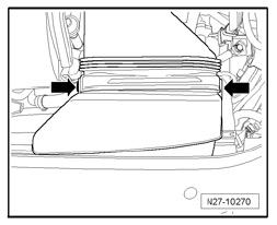 - Release tension on ribbed belt by swinging tensioning element using a 16 mm open-end wrench in direction of -arrow-.