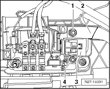 - Remove the self-locking nut - 4 - and remove pyrotechnic battery isolator - 3 - from connection threads, paying attention to the connected wire lengths.