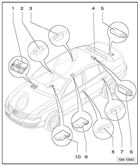 The illustration depicts component locations in the Passat Sedan. In the Passat Wagon, the component locations of the individual components are identical. Component is discontinued in the wagon.