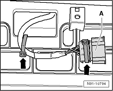 - Disconnect harness connector - A - on glove compartment and remove cable ties - arrows -.