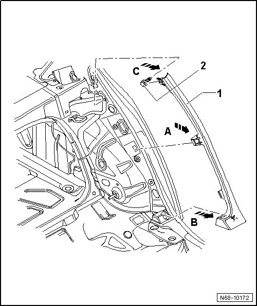 - Remove trim - 1 - in center area from mount in body and door seal molding - arrow A -.