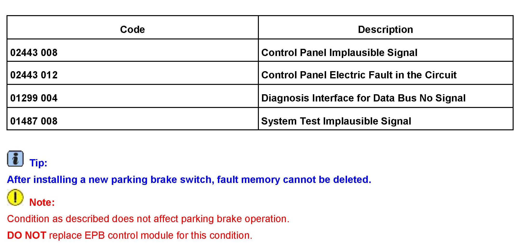 One or more of the following fault code entries are logged in the electronic parking brake system:
