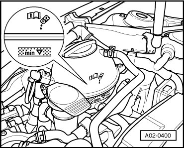 Inspection service: Coolant level above the "MIN marking" - arrow -.
