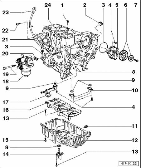 Oil pan, oil pump and oil filter bracket, assembly overview