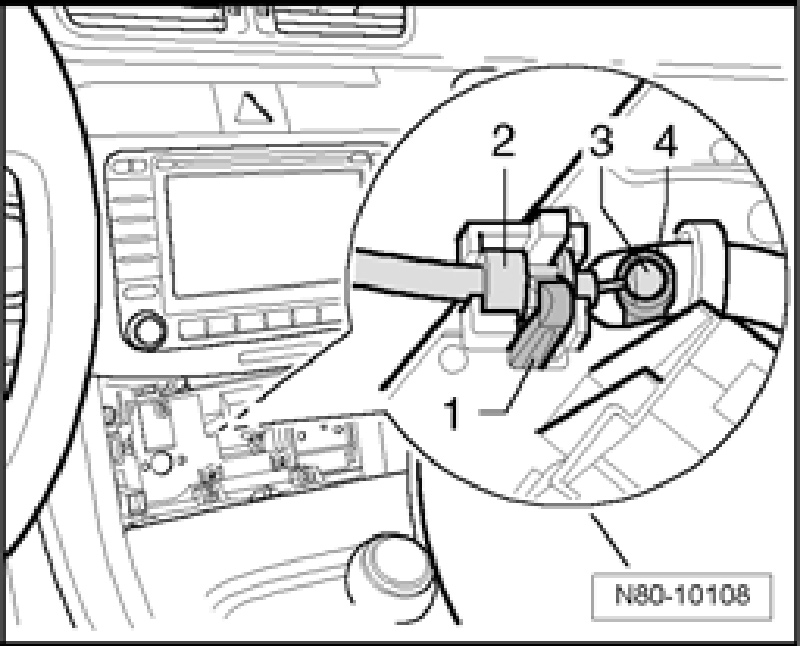 - Reach into center console and disengage locking mechanism -1- of Bowden cable sleeve -2- and remove Bowden cable sleeve from mount.