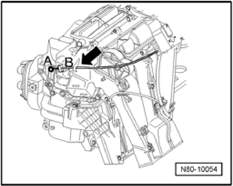 - Unclip Bowden cable at adjusting unit of temperature flap -A- and unclip heating unit -B-