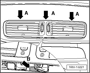- When installing the center vents, pay attention to the alignment - arrow B - on the instrument panel.